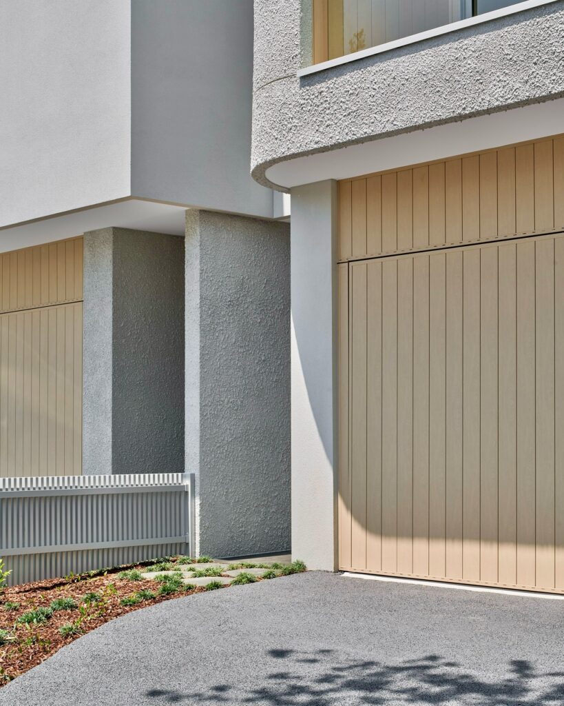 The Steel-Line Melbourne Garage Door clad in Knotwood plays a pivotal role in defining the architectural identity of the Agnes homes. Positioned prominently at the front of each townhouse, the garage door commands visual attention. The timber-look finish of Knotwood, a durable, aluminium-based cladding, mimics natural timber without the high maintenance, providing a sophisticated, warm contrast against the solid rendered walls. This balance enhances the homes' visual harmony and modern appeal - something that would be difficult to achieve with a plain garage door. Thus, by incorporating the Steel-Line Garage Door, the project achieves a seamless blend between contemporary and natural elements.